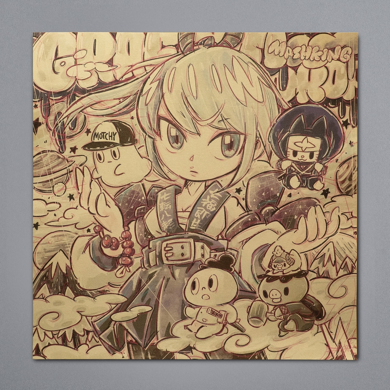 オリジナル漫画【餅左衛門と河童の兵次】を執筆中で、ステッカーやソフビ等のグッズも展開。展示会やライブペイント、販売イベントに参加しています。