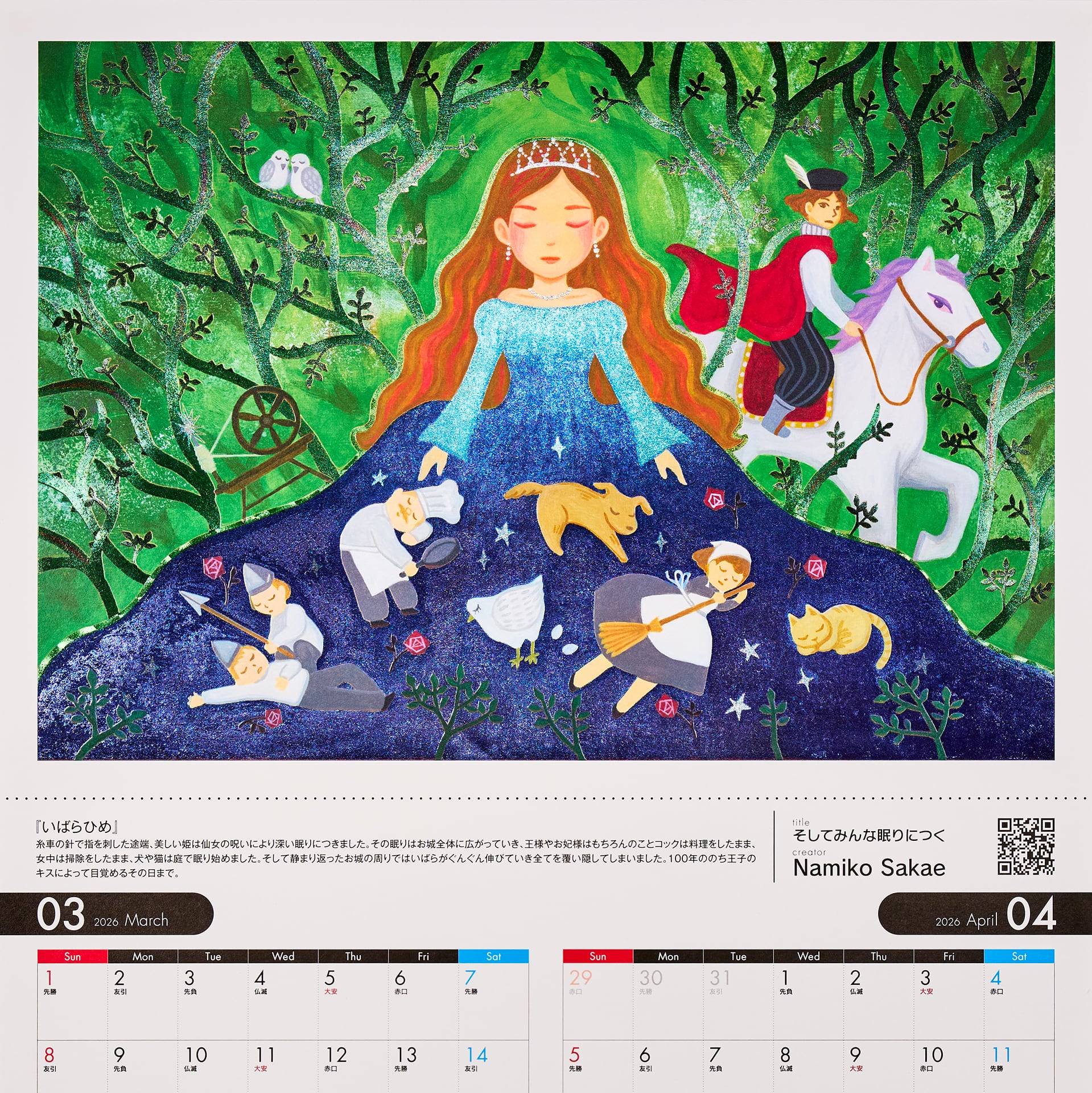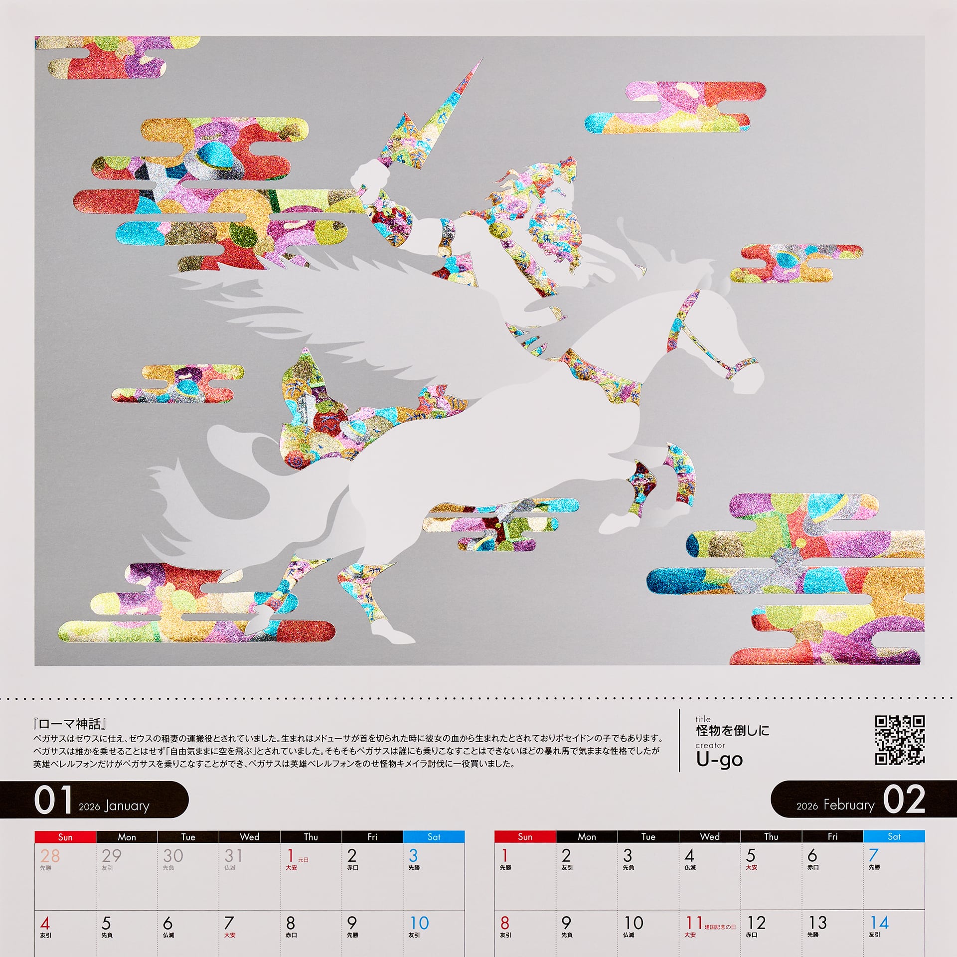 2026年は、干支の午(うま)をモチーフに7名のクリエイターが昔話・神話・童話の世界を描きます。各ページのイラスト作品はA4サイズとなっており、上部のミシン目と下部の点線に沿って切り離すと均等の余白が生まれるように工夫しておりますので額装にも最適です。